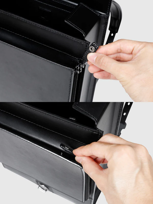 - La languette de la fermeture éclair comporte un bouton-pression de sécurité afin que la poche ne puisse pas être ouverte lorsque le rabat est fermé.